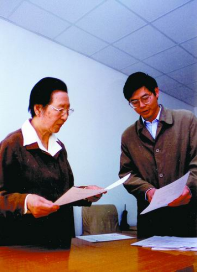夏培肃和研究生胡伟武讨论问题。