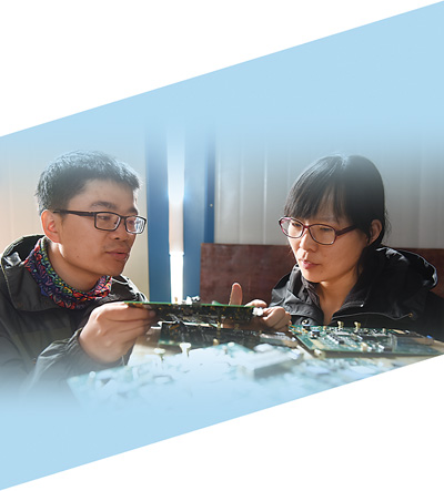 李骢(左)和同事在海子山上检查缪子探测器电子学板。