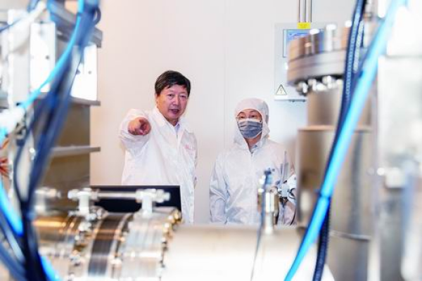 2025年9月,上海技物所国产自动化红外材料外延设备投入运行时,陆卫(左)和同事在观察设备状态。上海技物所供图
