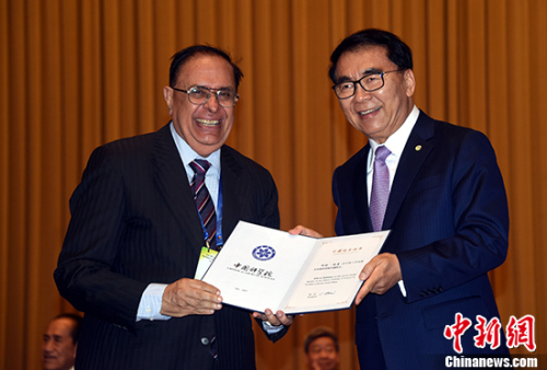 5月28日,中国科学院院长、学部主席团执行主席白春礼(右)向巴基斯坦卡拉奇大学教授阿塔·拉曼(Atta-ur Rahman)颁授中科院外籍院士证书。中新社记者 孙自法 摄