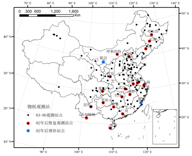 新中国成立后,竺可桢先生开始考虑全国性物候观测,1963年网络建成并开始观测,当年全国共有49个观测站点[3]。1963-1996年陆续有135个观测站点工作。其中,在“文革”期间,当竺先生见到有些物候观测站无法正常工作时,他奔走呼号,直到物候站恢复工作。2002年之后,在笔者艰难争取下恢复了其中的19个站点,并增补银川和福州两个观测站(图1)。在所有观测站点中,37个观测站点观测年份长于15年。