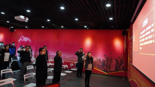 活动中,大家瞻仰了“两弹一星”功勋奖章获得者人物展,缅怀他们为“两弹一星”事业做出的历史性贡献,并向“两弹一星”元勋敬献花篮、深情鞠躬,致以崇高敬意;集体参观了中科院与“两弹一星”事业展,透过珍贵的照片、文物、档案、手稿,沿着重大历史事件的脉络,系统回顾中科院参与“两弹一星”科研攻关的历程。观看中科院与“两弹一星”宣传片后,大家面对党旗庄严举起右拳,重温入党誓词。